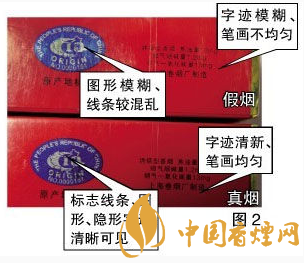 真品“中華”印刷套色準(zhǔn)確,字跡清新、筆畫均勻,字樣邊緣呈細(xì)微的齒輪狀,而不是人們普遍認(rèn)為的平滑狀。假煙字跡模糊、筆畫不均勻,字樣邊緣呈平滑狀。真品“中華”原產(chǎn)地標(biāo)志采用中國地圖圖案,細(xì)看海南島和臺灣島為空心,在某些角度和光線下圖案背景會呈現(xiàn)“中華”字樣,標(biāo)志線條、圖形、隱形字跡清晰可見。假煙原產(chǎn)地標(biāo)志圖形模糊、線條較混亂。