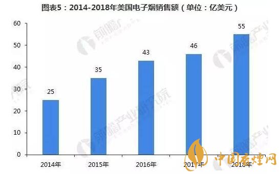根據(jù)《2017年世界煙草發(fā)展報告》顯示,北美是第一大電子煙市場,而跟據(jù)貝倫貝格銀行發(fā)表的一份報告稱,美國已經(jīng)成為世界上新一代產品銷量最大的市場。2014-2017年,美國電子煙銷售額逐年增長,2017年增長至46億美元。而2017年全球電子煙銷售額約為100億美元,美國就占了近50%的市場份額。預計2018年美國電子煙銷售額將達到55億美元。