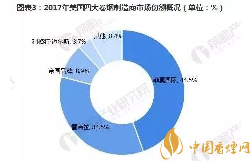 目前,美國市場上主要有四家大的卷煙制造商:菲莫國際、雷諾茲煙草公司、帝國品牌公司以及利格特邁爾斯煙草公司。2017年,菲莫國際在美國的市場份額為44.5%,較上年下降了2.1個百分點;雷諾茲煙草公司的市場份額為34.5%,同比上升0.8個百分點;帝國品牌公司市場份額增長了0.1個百分點,至8.9%;利格特邁爾斯煙草公司的市場份額增加了0.1個百分點,至3.7%。