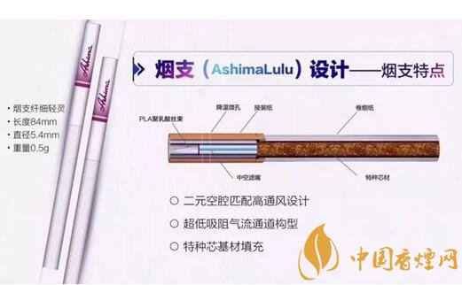 煙支Ashima Lulu,為纖細型,長84mm,直徑5.4mm,重量只有0.5克。具有二元空腔匹配高透風設(shè)計、超低阻氣流通道構(gòu)型、特種芯基材填充等特點。