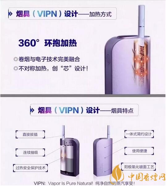 看到海報圖片上面介紹說,煙具VIPN為360度環(huán)抱加熱,具有直接拔插、連續(xù)抽吸、過熱安全保護技術(shù)等特點。