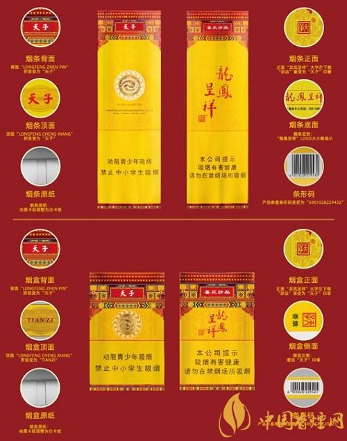 改名為天子(硬珍品龍鳳呈祥)之后,這款香煙的參數(shù)依然為:焦油量:11mg;煙堿量:1.1mg;一氧化碳量:12mg;煙長(zhǎng)為84mm。香煙售價(jià)為21元/包,批發(fā)價(jià)格:180.2元/條。