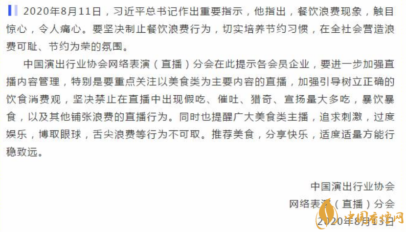 據中國演出行業(yè)協(xié)會官方微信消息,中國演出行業(yè)協(xié)會網絡表演 ( 直播 ) 分會在此提示各會員企業(yè),要進一步加強直播內容管理,特別是要重點關注以美食類為主要內容的直播,加強引導樹立正確的飲食消費觀,堅決禁止在直播中出現假吃、催吐、獵奇、宣揚量大多吃,暴飲暴食,以及其他鋪張浪費的直播行為。同時也提醒廣大美食類主播,追求刺激,過度娛樂,博取眼球,舌尖浪費等行為不可取。推薦美食,分享快樂,適度適量方能行穩(wěn)致遠。