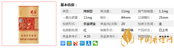 類型 :烤煙型 焦油量 :11mg 煙氣煙堿量 :1.1mg 一氧化碳量 :11mg