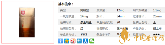 類(lèi)型 :烤煙型 焦油量 :12mg 煙氣煙堿量 :1.1mg 一氧化碳量 :14mg