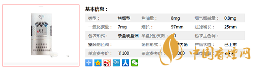 類型 :烤煙型 焦油量 :8mg 煙氣煙堿量 :0.8mg 一氧化碳量 :7mg