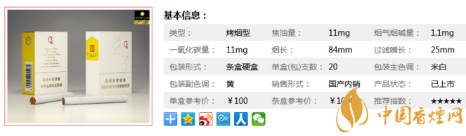 類型 :烤煙型 焦油量 :11mg 煙氣煙堿量 :1.1mg 一氧化碳量 :11mg
