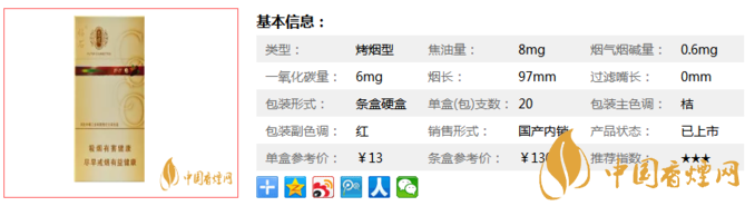 | 類型 :烤煙型 | 焦油量 :8mg | 煙氣煙堿量 :0.6mg | 一氧化碳量 :6mg |