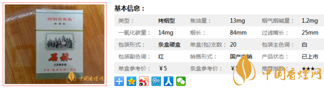 石林白香煙煙長84mm,過濾嘴長25mm,采用高難度的凸、平燙結(jié)合的燙金技術(shù);多工序膠凹印相結(jié)合,增加了商標(biāo)的制作難度;采用了具有較強防偽功能的潛影壓紋新技術(shù),從不同方向看,可見“石林”和“STONE FOREST”英文。下面我們一起來看石林白的參數(shù)信息:焦油量:13mg 煙堿量:1.2mg 一氧化碳量:14mg.