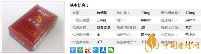 類型 :烤煙型 焦油量 :13mg 煙氣煙堿量 :1.3mg 一氧化碳量 :13mg