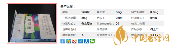 類型 :烤煙型 焦油量 :8mg 煙氣煙堿量 :0.7mg 一氧化碳量 :8mg
