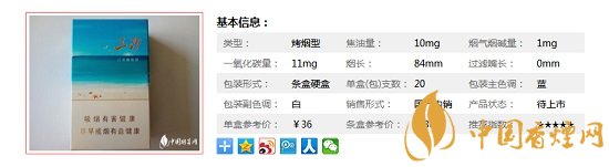 | 類型 :烤煙型 | 焦油量 :10mg | 煙氣煙堿量 :1mg | 一氧化碳量 :11mg |