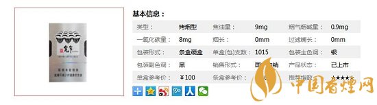 類型 :烤煙型 焦油量 :9mg 煙氣煙堿量 :0.9mg 一氧化碳量 :8mg