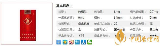 | 類型 :烤煙型 | 焦油量 :8mg | 煙氣煙堿量 :0.7mg | 一氧化碳量 :9mg |