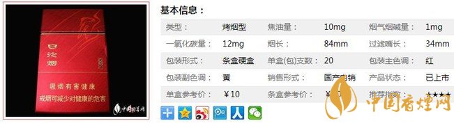 | 類型 :烤煙型 | 焦油量 :10mg | 煙氣煙堿量 :1mg | 一氧化碳量 :12mg |