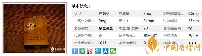 類型 :烤煙型 焦油量 :8mg 煙氣煙堿量 :0.8mg 一氧化碳量 :9mg