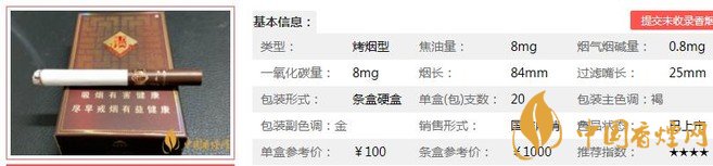 類型 :烤煙型 焦油量 :8mg 煙氣煙堿量 :0.8mg 一氧化碳量 :8mg