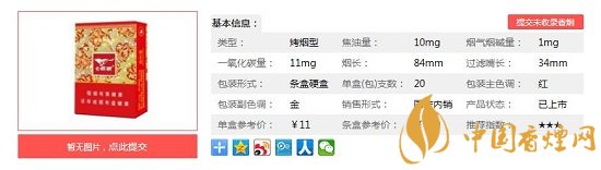 類型 :烤煙型 焦油量 :10mg 煙氣煙堿量 :1mg 一氧化碳量 :11mg