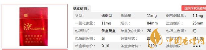 類型 :烤煙型 焦油量 :11mg 煙氣煙堿量 :1.1mg 一氧化碳量 :11mg