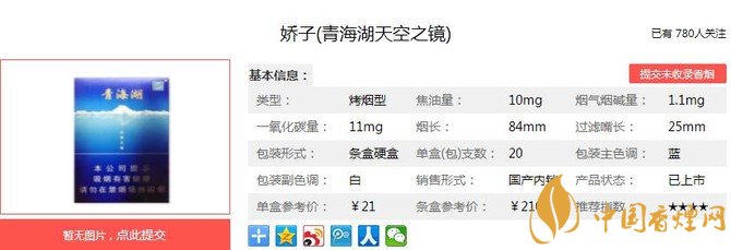 嬌子青海湖天空之鏡的包裝十分精致美觀,是一款令很多煙民因顏值而心動(dòng)行動(dòng)的香煙,但這款香煙地域性太強(qiáng),以至于很多煙民都沒有見過。經(jīng)香煙網(wǎng)小編市場(chǎng)調(diào)查嬌子青海湖天空之鏡售價(jià)為21元/包。