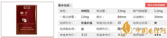 嬌子軟紫國寶煙支長84mm,過濾嘴長:30mm,該款產(chǎn)品采用了具有自主知識(shí)產(chǎn)權(quán)的復(fù)合生化減害技術(shù),能夠明顯降低煙氣中的有害物質(zhì)。下面我們一起來看嬌子軟紫國寶的參數(shù)信息:焦油量:13mg 煙堿量:1.2mg 一氧化碳量:13mg