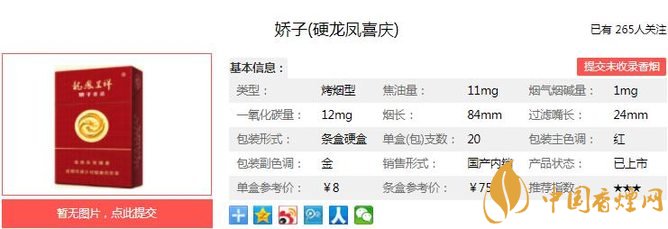 煙支長(zhǎng)84mm,過(guò)濾嘴長(zhǎng)24mm,龍鳳呈祥精品生產(chǎn)線(xiàn),28個(gè)環(huán)節(jié)精密檢測(cè)品質(zhì)保障,彰顯自然時(shí)尚清新的魅力。下面我們一起來(lái)看嬌子硬龍鳳喜慶的參數(shù)信息:焦油量:11mg 煙堿量:1.0mg 一氧化碳量:12mg