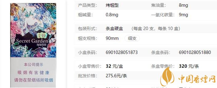 云煙(神秘花園)煙支長:90mm,烤煙型,包裝形式:條盒硬盒(每盒 20 支,每條 10 盒)。超細支的整體形式更凸顯產(chǎn)品的細致、優(yōu)雅、個性獨一,整個版面色調(diào)以紫羅蘭色為基礎色,藍、紅色為其點綴,凸顯設計的高貴、神秘。下面我們一起來看云煙(神秘花園)的參數(shù)信息:焦油量:8mg 煙堿量:0.8mg 一氧化碳量:9mg