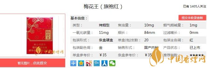 以上便是香煙網(wǎng)小編為大家介紹的關(guān)于梅花王旗袍紅多少錢一包 梅花王旗袍紅價格及口感分析的相關(guān)信息,看完之后大家是不是對于梅花王(旗袍紅)這款香煙的相關(guān)信息更加了解呢。大家還想查詢更多的相關(guān)內(nèi)容歡迎點(diǎn)擊:梅花王硬紅多少錢一包 梅花王硬紅參數(shù)及口感(內(nèi)附圖片)
