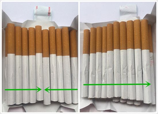 牡丹香煙小盒真煙,同一包內(nèi)真煙煙支卷接紙有兩個(gè)相反的搭口方向;而假煙煙支卷接紙搭口方向?yàn)橥粋€(gè)。