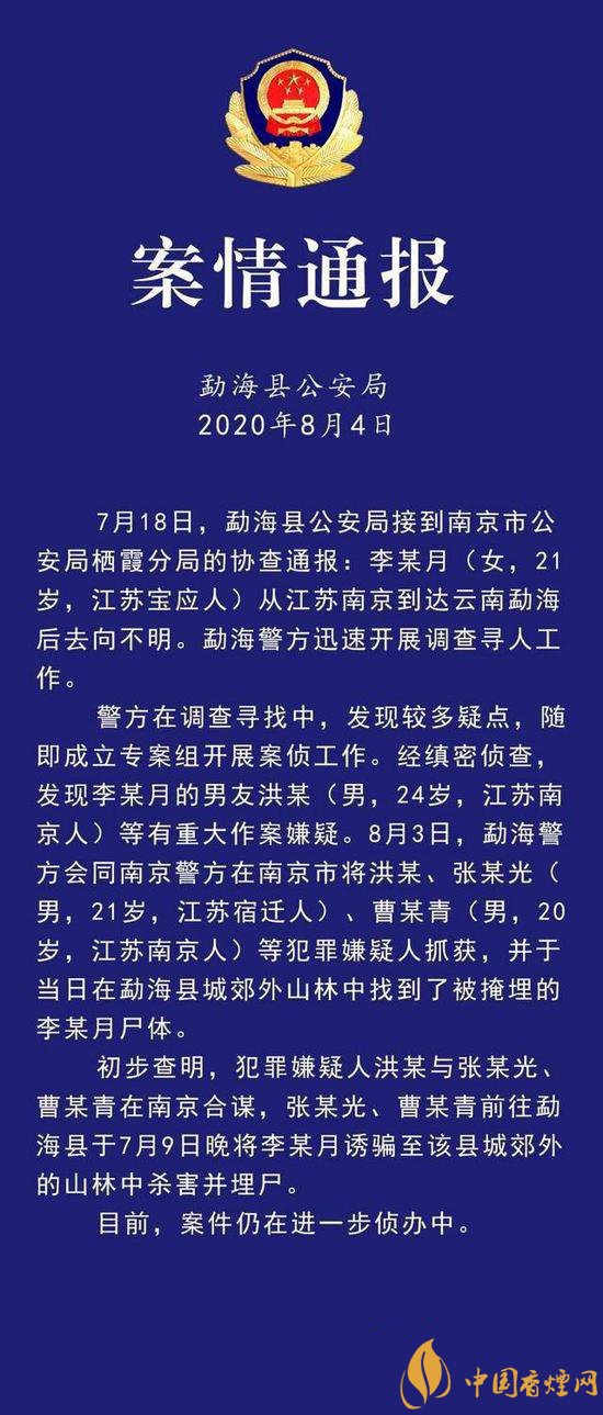 8月4日晚,西雙版納州勐??h公安局發(fā)布通報(bào),經(jīng)調(diào)查尋找,失聯(lián)25天的南京女大學(xué)生月月(化名),已于7月9日晚,被其男友洪某伙同張某光、曹某青,誘騙至勐海縣城郊山林殺害并埋尸。
