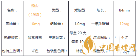 在了解了延安香煙最貴的多少錢之后,為了大家能更詳見的了解此煙,小編特意將延安1935香煙的核心參數(shù)進(jìn)行了整理,以便于對(duì)它進(jìn)行更深入的了解。