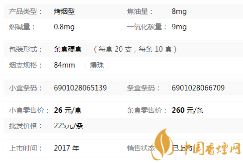 類型 :烤煙型 焦油量 :8mg 煙氣煙堿量 :0.8mg 一氧化碳量 :9mg