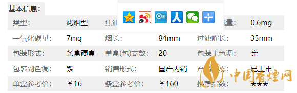 類型 :烤煙型 焦油量 :6mg 煙氣煙堿量 :0.6mg 一氧化碳量 :7mg