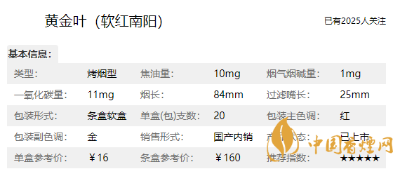 黃金葉軟紅南陽香煙價格及參數(shù)一覽2020
