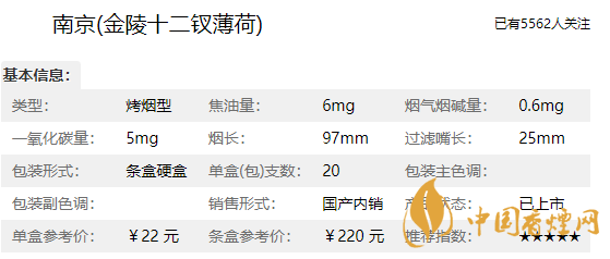 南京金陵十二釵薄荷煙外觀清新典雅,以淡綠色為主色調(diào),配以金陵十二釵美人圖,格調(diào)清新淡雅。整個(gè)煙包精致優(yōu)雅,煙支纖細(xì)超長(zhǎng)別致,個(gè)性鮮明,煙香優(yōu)雅而飄逸,口感細(xì)膩柔和,超低的焦油量,勁道適中,價(jià)格適宜。深受廣大煙民的喜愛(ài),特別是女性煙客對(duì)它格外青睞。據(jù)小編調(diào)查得知市場(chǎng)銷(xiāo)售參考價(jià)為22元/包