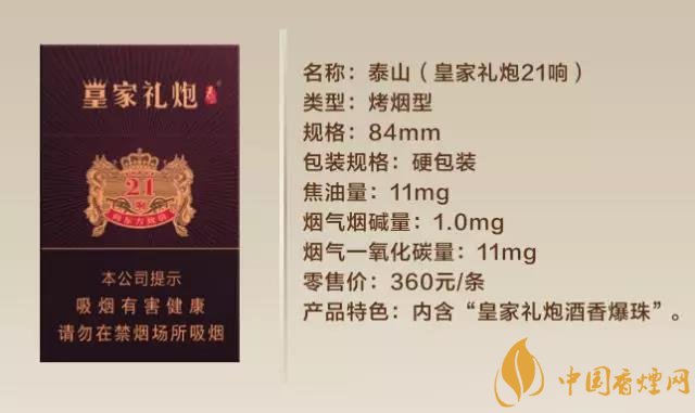 泰山(皇家禮炮21響)是山東中煙秉承中西禮儀文化,運用創(chuàng)新科技精心打造。不僅有著豐富的文化內(nèi)涵,而且產(chǎn)品極具特點,在濾嘴中添加了“皇家禮炮21年”頂級威士忌的爆珠。泰山煙新品多少錢?2018皇家禮炮21響多少錢一盒 皇家禮炮21響香煙售價36元/包