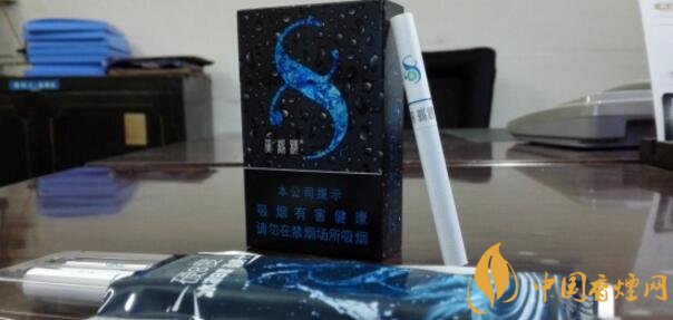 這款香煙正面外觀(guān)來(lái)看給人的第一印象它就是一款涼煙,炫酷純黑的底色搭配晶亮水滴為主色調(diào),同時(shí)冰藍(lán)顏色的抽象冰塊圖案形成了一個(gè)數(shù)字“8”形狀,讓人覺(jué)得涼爽的同時(shí)也突出了產(chǎn)品LOGO。