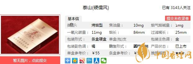 泰山硬儒風(fēng)煙支長84mm,過濾嘴長25mm,“儒風(fēng)泰山”的配方和調(diào)香技術(shù)嫁接了緩解精神壓力的“香薰”機(jī)理,發(fā)揮SPA功效創(chuàng)造出一種“心悅神定”的氣氛。下面我們一起來看泰山硬儒風(fēng)的參數(shù)信息:焦油量:10mg 煙堿量:1.0mg 一氧化碳量:11mg
