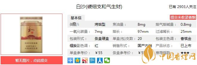 一、白沙硬細支和氣生財香煙價格