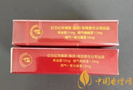翻轉(zhuǎn)至煙盒的左側(cè),都是生產(chǎn)廠商的名稱(chēng)和這款香煙的理化含量標(biāo)識(shí)。廠家同為“紅云紅河煙草(集團(tuán))有限責(zé)任公司”。