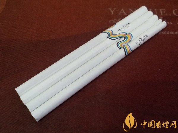 煙支通體純白,白到卷煙紙上連豎的或是橫的紋理都沒有。白色的水松紙上除了阿里山的Logo外,還飄蕩著一條“藍白紅白黃白藍白黑”的“幾”字形絲帶,很是奪目。