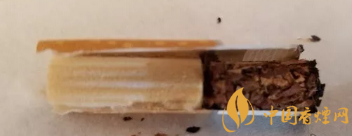 剖開歐免The King濾嘴,是經(jīng)典的一段式醋酸纖維絲束濾嘴段。從絲束的顏色變化,很容易看到降焦孔開在了絲束的前1/3位置,顏色變化均勻。降焦孔后,每個孔位置,有條帶狀的顏色加深,是空氣介入流動所致。從煙絲外觀看,煙葉的品級非常好,用料實(shí)。攤開煙絲,看到的是明黃、棕黃的烤煙煙絲比例較大,間雜有比例稍小的深棕色的晾煙煙絲,未見涂布制絲和膨脹制絲。里面混雜與切成薄片狀的煙梗。#p#副標(biāo)題#e#