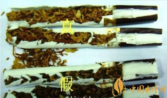 真品煙支采用二段式生物降焦濾嘴,煙絲顏色為金黃色,切絲寬度均勻一致;假煙多采用單一的普通濾嘴,煙絲顏色多為褐色,與真品存在明顯差異。