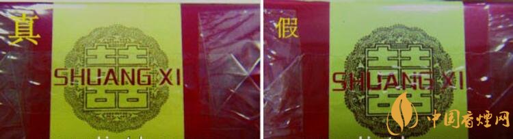 真品商標(biāo)紙顏色為深紅色,正面喜字燙金邊緣有凸起感;假煙商標(biāo)紙顏色多為鮮紅色,正面喜字為平版印刷且邊緣未見凸起感,與真品存在明顯差異。