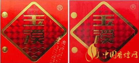 (2)真品卷煙玉溪商標(biāo)燙金圖案,圖案燙金完整清晰,無漏燙現(xiàn)象,菱形圖案邊緣燙金線呈現(xiàn)凹槽。該款假冒卷煙商標(biāo)燙金圖案燙金有漏燙或掉金,菱形圖案邊緣燙金線平整。(圖2左真右假)