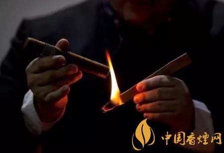 雪茄煙翻開一端(尾部)是點著的一端,不要將尾部直接放在火焰上,也不要先將雪茄放在嘴里。應(yīng)當先用手拿住雪茄,將尾部以45°角接近火源一英寸處,這么做的意圖是為了預(yù)熱或是將煙灸熱以保證雪茄能充沛、均勻的點著。在灸燒時旋轉(zhuǎn)一下雪茄,當雪茄煙尾部已均勻加熱,變得焦黑和發(fā)亮?xí)r,將雪茄置入口中。