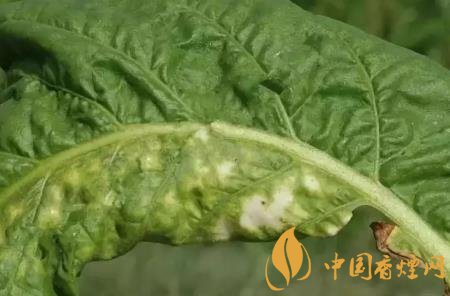 癥狀:幼嫩葉片發(fā)?。翰∪~直立;較大葉片發(fā)?。撼跗谛纬牲S色圓斑,后病斑中間下陷,背面產(chǎn)生灰色或藍(lán)色霉層,嚴(yán)重時病斑融合成褐色壞死大斑,病葉皺縮扭曲。常表現(xiàn)系統(tǒng)感染,煙株矮化凋萎。在花、蒴果上也出現(xiàn)病斑。