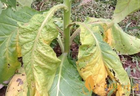 癥狀:煙草青枯病是維管束病害,典型癥狀為枯萎,病株多為一側(cè)枯萎,拔出后可見發(fā)病的一側(cè)支根變黑腐爛,未顯癥的一例根系大部分正常。葉片發(fā)病:初期軟化萎蔫,但仍為青色,故稱“青枯病”,隨著細(xì)菌充滿葉脈,兩天后葉脈變黑,葉內(nèi)為黃色網(wǎng)狀病斑。莖發(fā)病:出現(xiàn)長形黑色條斑,有的條斑擴(kuò)展到病株頂部或枯萎的葉柄上。到發(fā)病中后期,全部葉片萎蔫,條斑表皮變黑腐爛,病株莖和葉脈導(dǎo)管變黑,根部也變黑腐爛,甚至莖髓部呈蜂窩狀或全部腐爛形成空腔,僅留木質(zhì)部。橫剖病莖用力擠壓切口,從導(dǎo)管溢出黃白色菌膿。