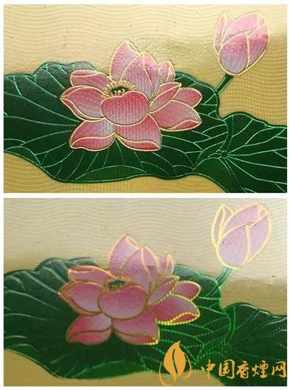 真品卷煙商標(biāo)紙上的荷花花瓣采用漸變技術(shù),顏色由粉紅色向白色過渡,花蕊處金色線條清晰,圖案印刷自然協(xié)調(diào),立體感強;假煙采用普通仿制技術(shù),顏色搭配較為死板,花蕊處金色線條模糊、擠成一團,圖案印刷粗糙、立體感差。