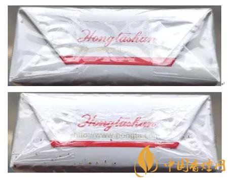 真品卷煙:1.透明紙燙封收縮均勻、自然,有烙鐵痕跡。2.商標(biāo)紙拐角折疊空隙較大。